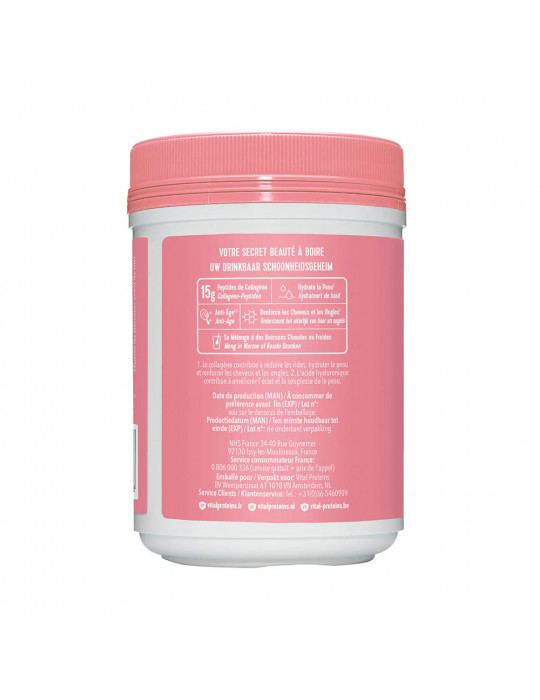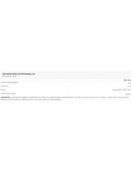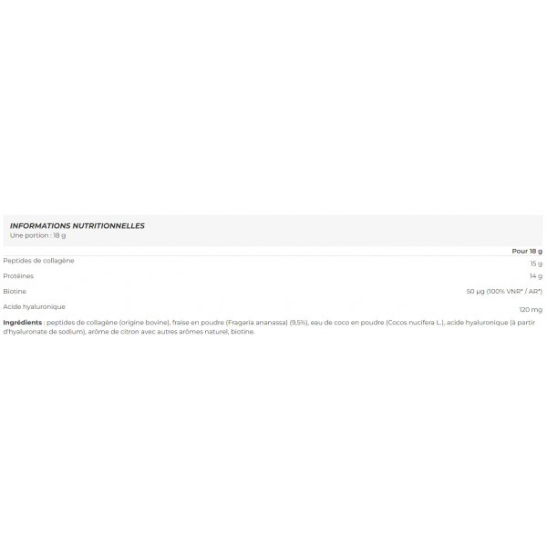 Ingrediënten: collageenpeptiden (afkomstig van runderen), aardbeipoeder (Fragaria ananassa) (9,5%), kokoswaterpoeder (Cocos nucifera L.), hyaluronzuur (uit natriumhyaluronaat), citroenaroma met andere natuurlijke aroma's, biotine.