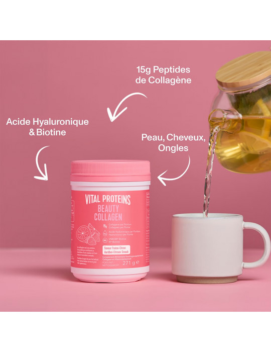Beauty Collagen is verkrijgbaar in een verfrissende aardbei-citroensmaak en biedt een revitaliserende ervaring van binnenuit, voor een stralende schoonheid van buitenaf!