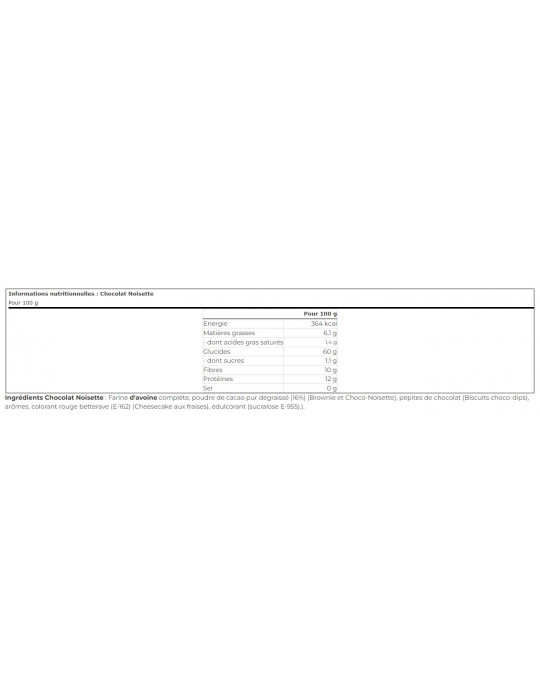 Ingrediënten Chocolade Hazelnoot : Volkoren havermeel, ontvet puur cacaopoeder (16%) (Brownie en Choco-Noisette), chocolade chips (Biscuits choco-dips), aroma's, rode bieten kleurstof (E-162) (Aardbeien Cheesecake), zoetstof (sucralose E-955).
