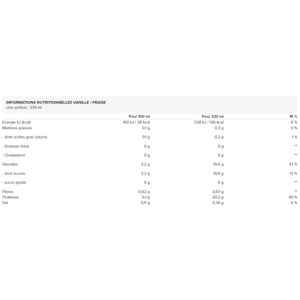 Ingrediënten Vanille / Aardbei: Melkeiwitconcentraat (42%), water, magere melk (25%), aroma, zuurteregelaar (trinatriumcitraat), kleurstof (lycopeen), stabilisator (carrageen), zoetstof (sucralose).