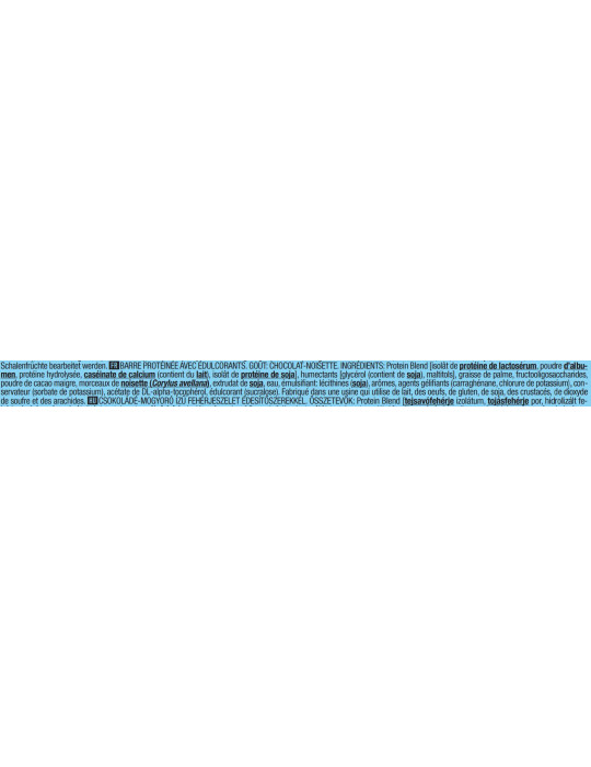 Ingrediënten hazelnootchocolade: Eiwitmengsel (wei-eiwitisolaat, albumenpoeder, gehydrolyseerd eiwit, calciumcaseïnaat, soja-eiwitisolaat), bevochtigingsmiddelen [glycerol (bevat soja), maltitolen], palmvet, fructooligosachariden, water, mager cacaopoeder, stukjes hazelnoot (Corylus avellana), soja-extrudaat, emulgator : lecithine(soja), aroma's, geleermiddelen (carrageen, kaliumchloride), conserveermiddel (kaliumsorbaat), DL-alfa-tocoferolacetaat, zoetstof (sucralose).