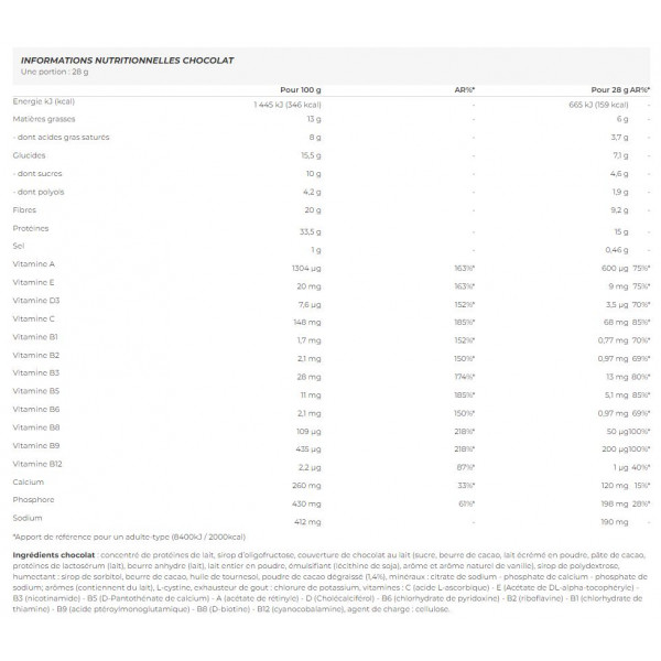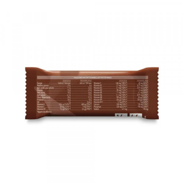 Ingrediënten voor chocolade melkchocoladecoating: melkeiwitconcentraat, oligofructosestroop, melkchocoladecoating (suiker, cacaoboter, mageremelkpoeder, cacaomassa, wei-eiwit (melk), watervrije boter (melk), volle melkpoeder, emulgator (sojalecithine), aroma en natuurlijk vanillearoma), polydextrosestroop, bevochtigingsmiddel : sorbitolstroop, cacaoboter, zonnebloemolie, ontvette cacaopoeder (1,4%), mineralen : natriumcitraat - calciumfosfaat - natriumfosfaat; aroma's (bevatten melk), L-cystine, smaakversterker: kaliumchloride, vitaminen : C (L-ascorbinezuur) - E (DL-alfa-tocoferylacetaat) - B3 (nicotinamide) - B5 (D-calciumpantothenaat) - A (retinylacetaat) - D (cholecalciferol) - E (DL-alfa-tocoferylacetaat) B6 (pyridoxine hydrochloride) - B2 (riboflavine) - B1 (thiamine hydrochloride) - B9 (pteroylmonoglutaminezuur) - B8 (D-biotine) - B12 (cyanocobalamine), vulstof : cellulose.