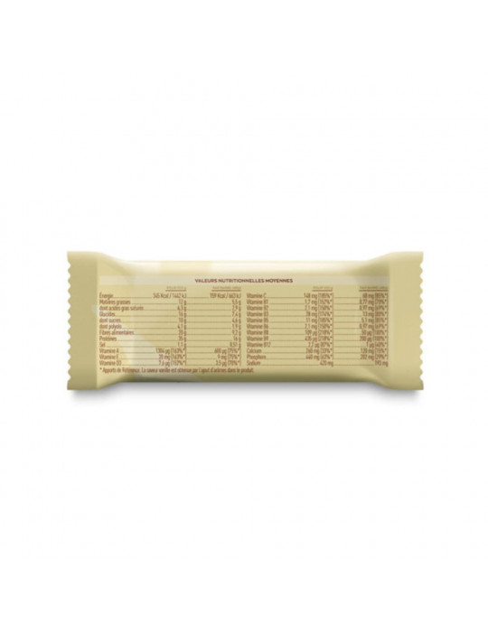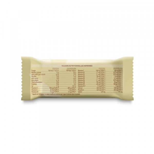 Ingrédients VanilleMelkchocoladecoating: melkeiwitconcentraat, oligofructosestroop, melkchocoladecoating (suiker, cacaoboter, mageremelkpoeder, cacaomassa, wei-eiwit (melk), watervrije boter (melk), melkpoeder, emulgator: sojalecithine, aroma, natuurlijk vanillearoma), coatingagent: polydextrosestroop, zoetstof: sorbitolstroop, cacaoboter, zonnebloemolie, mineralen: natriumcitraat - calciumfosfaat - natriumfosfaat, vitaminen : C (L-ascorbinezuur) - E (DL-alfa-tocoferylacetaat) - B3 (nicotinamide) - B5 (D-calciumpantothenaat) - A (retinylacetaat) - D (cholecalciferol) - E (DL-alfa-tocoferylacetaat) B6 (pyridoxine hydrochloride) - B2 (riboflavine) - B1 (thiamine hydrochloride) - B9 (pteroylmonoglutaminezuur) - B8 (D-biotine) - B12 (cyanocobalamine), L-cystine, aroma, smaakversterker : kaliumchloride.