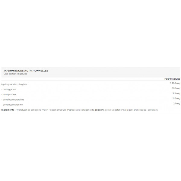 Ingrediënten: Peptan 5000 LD marien collageenhydrolysaat (viscollageenpeptiden), veganistische capsule (omhullingsmiddel: pollulan).