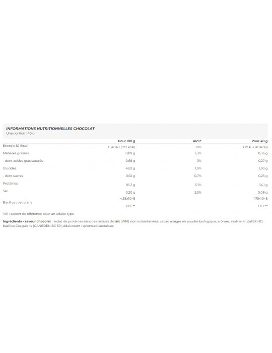 Ingrediënten - chocoladesmaak : niet-geïnstantiseerd natief serum melkeiwitisolaat (WPI), biologisch mager cacaopoeder, aroma's, Frutafit® HD inuline, bacillus coagulans (GANEDEN BC 30), zoetstof: splenda® sucralose.