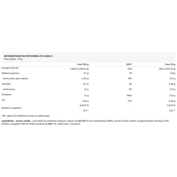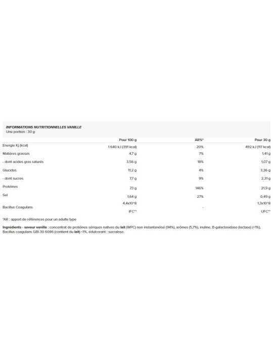Ingrediënten - vanillesmaak : niet-geïnstantiseerd natief serum melkeiwitconcentraat (WPC) (94%), aroma's (5,7%), inuline, B-galactosidase (lactase) (<1%), Bacillus coagulans GBI-30 6086 (bevat melk) <1%, zoetstof: sucralose.