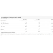 Ingrediënten - dubbele chocoladesmaak: tarwebloem, melkeiwit, bruine suiker, plantaardige glycerine, pure chocolade chips (8%) [cacaomassa, suiker, emulgator (sojalecithine), aroma], olijfolie, glutaminepeptide(tarwe), kokosolie, water, inuline (cichoreiwortel), cacaopoeder, rijsmiddel (bicarbonaat, wijnsteen), aroma.