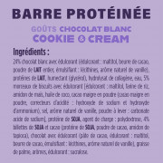 Ingrediënten - Koekjes & roomsmaak 24% witte chocolade met zoetstof (zoetstof: maltitol, cacaoboter, cacaopoeder) MELK emulgator: lecithine, natuurlijk vanillearoma), eiwit uit MELK, bevochtigingsmiddel (glycerol), collageenhydrolysaat, water, eiwit van SOJA, 5% gezoete biscuitstukjes [édulcorant : maltitol, farine de riz, amidon de maïs, huile de coco, cacao maigre en poudre (cacao maigre en poudre, correcteurs d'acidité : hydroxyde de sodium et hydroxyde d'ammonium), sel, arôme naturel de vanille, poudre à lever : carbonate acide de sodium], vulstof: polydextrose, 4% knuppels van SOJA en cacao (SOYA-eiwit, cacaopoeder, tapiocazetmeel), chocolade met zoetstof (cacaomassa, zoetstof: maltitol, cacaoboter, emulgator: lecithinen, natuurlijk vanillearoma), palmvet, aroma's.