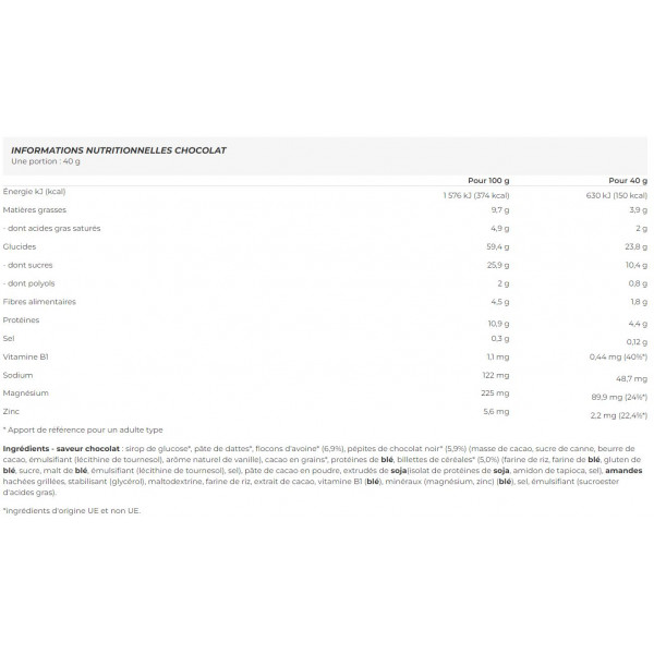 Ingrediënten - chocoladesmaak : glucosestroop*, dadelpasta*, havervlokken* (6,9%), pure chocolade chips* (5,9%) (cacaomassa, rietsuiker, cacaoboter, emulgator (zonnebloem lecithine), natuurlijk vanille aroma), cacaobonen*, tarwe-eiwit, graanbilletjes* (5,0%) (rijstbloem, tarwebloem, tarwegluten, suiker, tarwemout, emulgator (zonnebloemlecithine), zout), cacaomassa poeder, geëxtrudeerde soja (soja-eiwitisolaat, tapiocazetmeel, zout), gehakte geroosterde amandelen, stabilisator (glycerol), maltodextrine, rijstbloem, cacao-extract, vitamine B1(tarwe), mineralen (magnesium, zink)(tarwe), zout, emulgator (vetzuursaccharester).