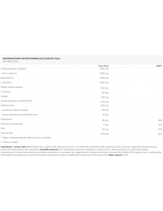 Ingrediënten - cola smaak :l-argininehydrochloride16%, beta-Alanine 14%, L-citrulline 13%, zuurteregelaar (appelzuur), aroma's, magnesiumzouten van citroenzuur, instant extract van zwarte theebladeren(Camellia sinensis) 8,0%, verdikkingsmiddel (xanthaangom), L-tyrosine 2,9%, watervrije cafeïne 2,4%, vulstof (polydextrose), inositol, zoetstoffen (cyclamaten, acesulfaam K, sucralose), antiklontermiddel (siliciumdioxide), kleurstof (Noir Brillant PN), zinkoxide, nicotinamide, pyridoxine hydrochloride, zuurteregelaar (natriumcarbonaat), BioPerine® extract van zwarte peper(Piper nigrum) 0,01%.