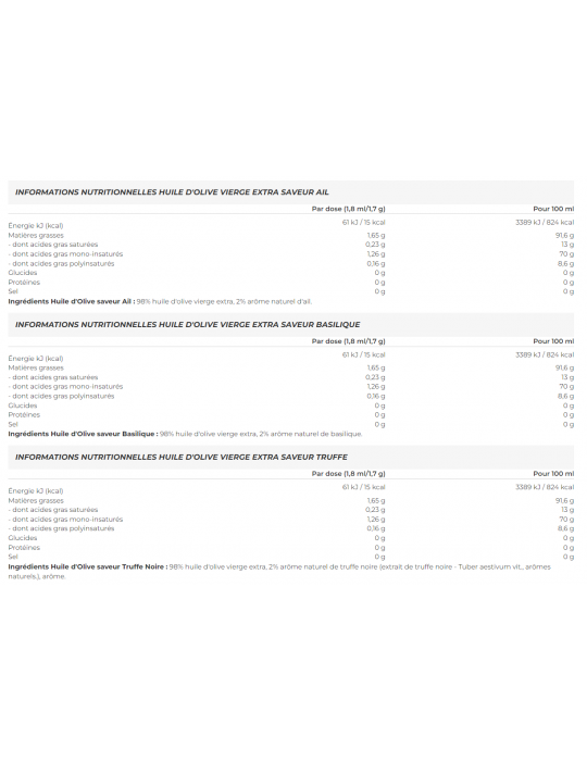 Ingrediënten Olijfolie met basilicumsmaak :98% extra vierge olijfolie, 2% natuurlijk basilicumaroma.