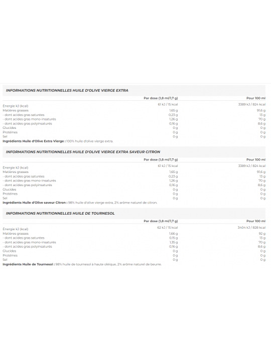 Ingrediënten Olijfolie met citroensmaak :98% extra vierge olijfolie, 2% natuurlijk citroenaroma.