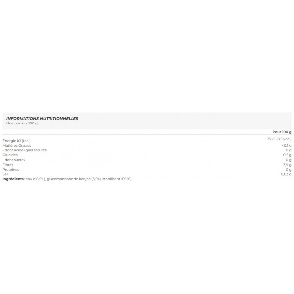 Ingrediënten: water (96,5%), konjac glucomannan (3,5%), stabilisator (E526).