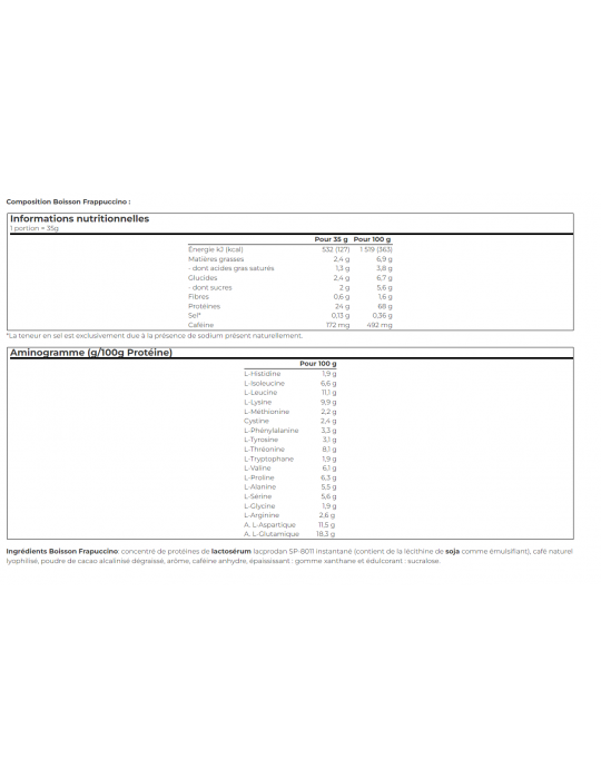 Ingrediënten Frapuccino drink: Lacprodan SP-8011 Instant wei-eiwitconcentraat (bevat sojalecithine als emulgator), gevriesdroogde natuurlijke koffie, vetvrij alkalisch cacaopoeder, aroma, watervrije cafeïne, verdikkingsmiddel: xanthaangom en zoetstof: sucralose.