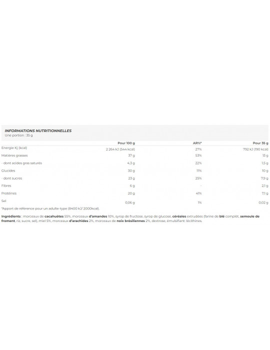Ingrediënten: stukjes pinda 55%, stukjes amandel 10%, fructosestroop, glucosestroop, geëxtrudeerde granen ( volkorentarwemeel, tarwegriesmeel, rijst, suiker, zout), honing 5%, stukjes pinda 2%, stukjes paranoot 2%, dextrose, emulgator: lecithine.