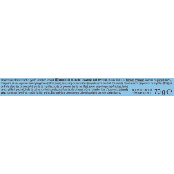 Ingrediënten bosbessengeur :havervlokken (bevat gluten) (42%), margarine [huiles végétales non-hydrogénées (palme, colza), eau], bruine suikersiroop (invertsuikerstroop en niet-invertsuikerstroop), rietsuiker, bosbessenbereiding (4%) [jus de fruits et purées de concentré (purée de myrtilles, purée de pomme, jus de myrtilles), sucre, sirop de glucose-fructose, farine de riz, gélifiant (pectine), huile de palme non-hydrogénée, acidifiant (acide citrique), arôme naturelle, fibre d’agrumes], , sojabloem, bevochtigingsmiddel (glycerol), bosbes (0,5%), aroma.