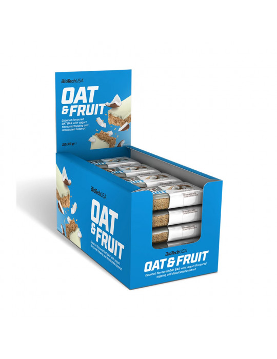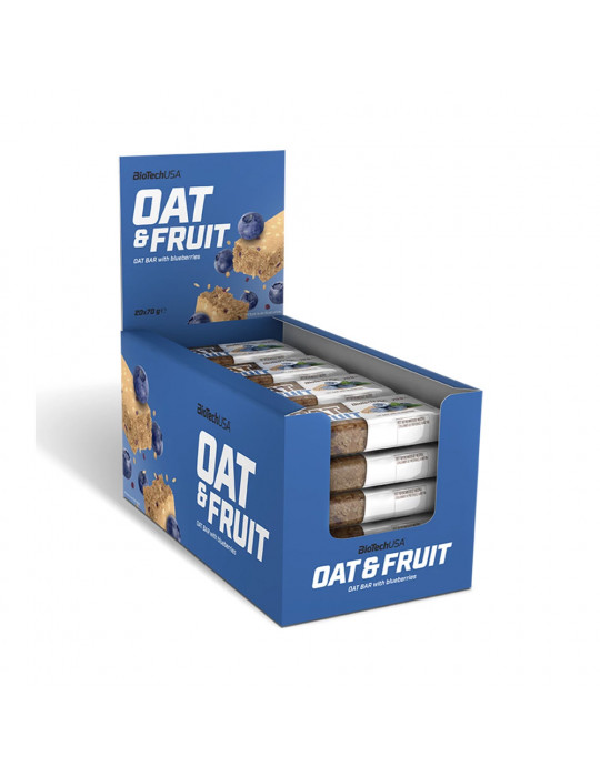 De verpakking Oat Bars (20x70 g) van het bekende merk Biotech USA zijn repen rijk aan havervlokken en een bron van vezels (tussen 2 en 3%).