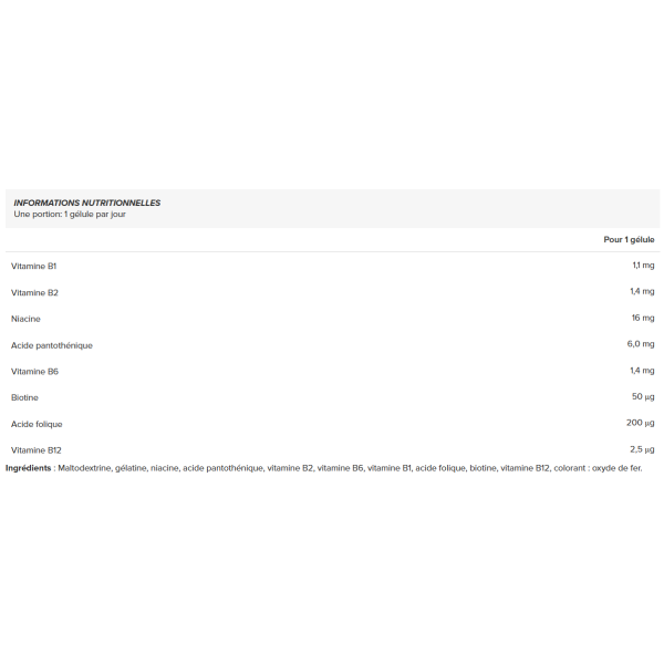 Ingrediënten: maltodextrine, gelatine, niacine, pantotheenzuur, vitamine B2, vitamine B6, vitamine B1, foliumzuur, biotine, vitamine B12, kleurstof: ijzeroxide.