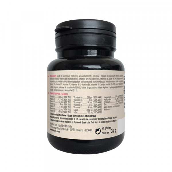 Ingrediënten: magnesiumoxide, vitamine C, antiklontermiddelen : cellulose - magnesiumstearaat, vitamine E, vitamine B8 (maltodextrine), vitamine B9 (maltodextrine), vitamine B5, zinkoxide, mangaanbisglycinaat, kopergluconaat, natriumseleniet (maltodextrine), vitamine A (acacia, maltodextrine, dl-alfa tocoferol), vitamine B3, vitamine B1, vitamine B2, vitamine B12, vitamine B6, vitamine D (gemodificeerd zetmeel (E1450), sucrose, Arabische gom (E414), geraffineerde zonnebloemolie, dl-alfa tocoferol (E307)), kaliumjodide. Plantaardige capsule: hydroxypropylmethylcellulose, kleurstof: koper-chlorofylcomplex (E141).