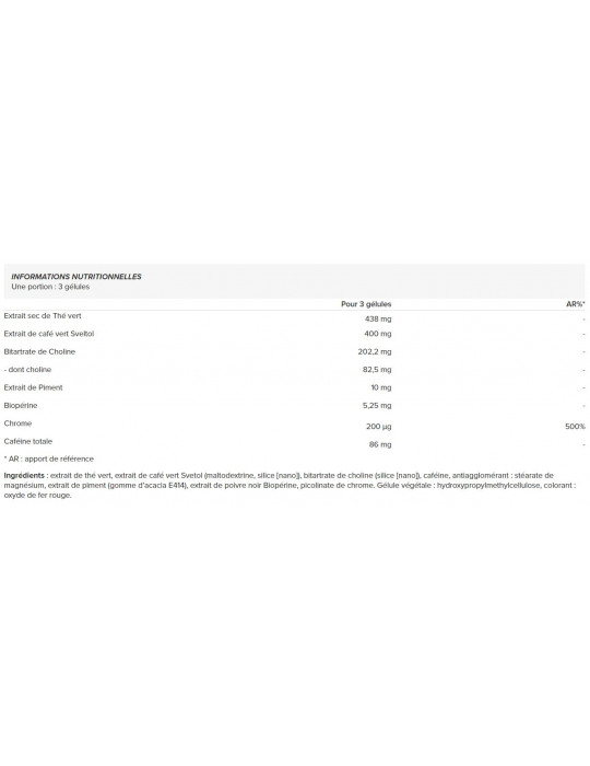 [nano]Ingrediënten: groene thee-extract (Theaceae Camellia sinensis), Svetol groene koffie-extract (Coffea robusta), cholinebitartraat (silica ), cafeïne, antiklontermiddel: magnesiumstearaat, chilipeper-extract (Capsium annuum, vulstof: microkristallijne cellulose), zwarte peper-extract (Piper nigrum), chroompicolinaat. Capsule: gelatine.