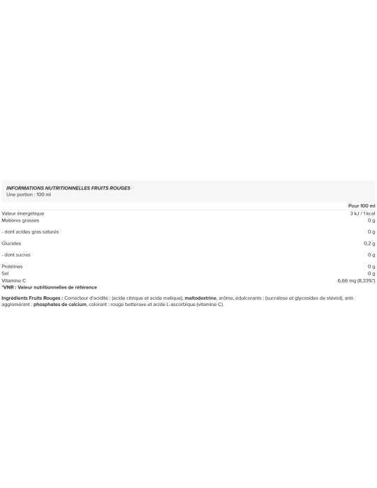 Rode Vruchten ingrediënten: zuurteregelaar: (citroenzuur en appelzuur), maltodextrine, aroma, zoetstoffen: (sucralose en steviolglycosiden), antiklontermiddel: calciumfosfaten, kleurstof: bietenrood en L-ascorbinezuur (vitamine C).