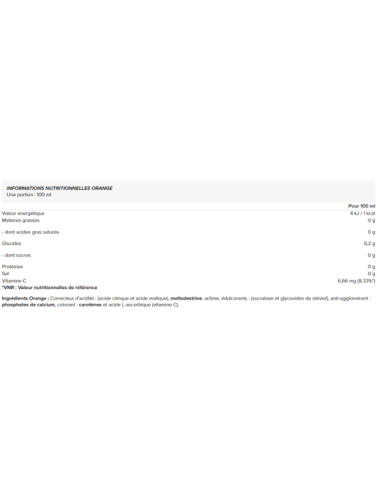 Oranje ingrediënten: zuurteregelaar: (citroenzuur en appelzuur), maltodextrine, aroma, zoetstoffen: (sucralose en steviolglycosiden), antiklontermiddel: calciumfosfaten, kleurstof: carotenen en L-ascorbinezuur (vitamine C).