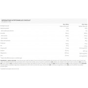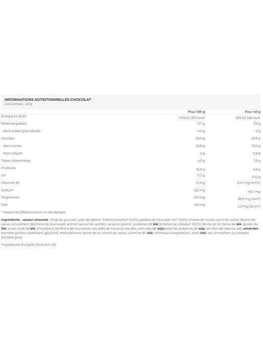 Ingrediënten - chocoladesmaak : glucosestroop*, dadelpasta*, havervlokken*(6,9%), pure chocolade chips* (5,9%) (cacaomassa, rietsuiker, cacaoboter, emulgator (zonnebloem lecithine), natuurlijk vanille aroma), cacaobonen*, tarwe-eiwit, graanbilletjes*(5,0%) (rijstbloem, tarwebloem, tarwegluten, suiker, tarwemout, emulgator (zonnebloemlecithine), zout), cacaomassa poeder, geëxtrudeerde soja (soja-eiwitisolaat, tapiocazetmeel, zout), gehakte geroosterde amandelen, stabilisator (glycerol), maltodextrine, rijstbloem, cacao-extract, vitamine B1(tarwe), mineralen (magnesium, zink)(tarwe), zout, emulgator (vetzuursaccharester).
