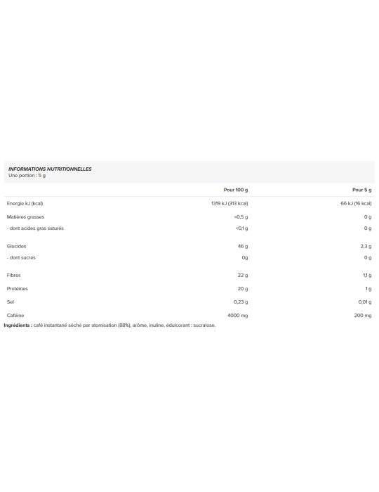 Ingrediënten: gesproeidroogde oploskoffie (88%), aroma, inuline, zoetstof: sucralose.