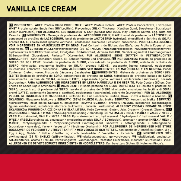 Ingrediënten Vanille : Eiwitmengsel (Whey Eiwit Isolaat (Emulgator (Sojalecithine)), Whey Eiwit Concentraat, Gehydrolyseerd Whey Eiwit Isolaat), Smaakstoffen, Kleurstof (Curcumine), Verdikkingsmiddel (Xanthaangom), Zoetstoffen (Acesulfaam-K, Sucralose).