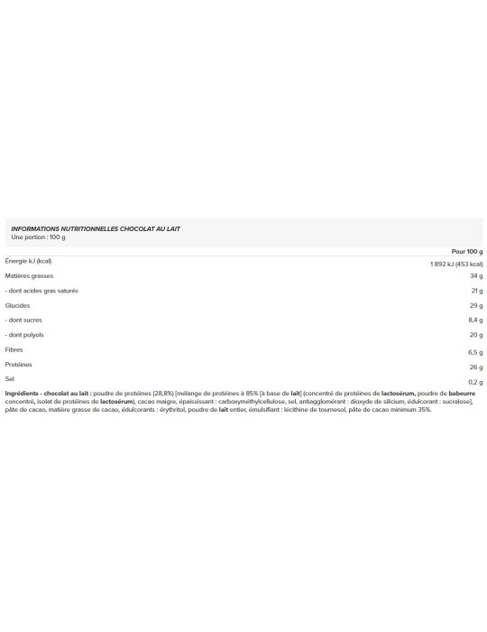 Ingrediënten - melkchocolade: eiwitpoeder (28,8%) [85% eiwitmengsel [op basis van melk] (wei-eiwitconcentraat, geconcentreerd karnemelkpoeder , wei-eiwitisolaat), magere cacao, verdikkingsmiddel: carboxymethylcellulose, zout, antiklontermiddel: siliciumdioxide, zoetstof: sucralose], cacaomassa, cacaovet, zoetstoffen: erythritol, volle melkpoeder, emulgator: zonnebloemlecithine, minimaal 35% cacaomassa.