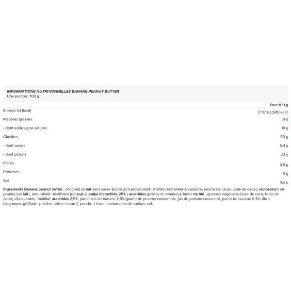 Ingredienten Banaan pindakaas : chocolade melk zonder toegevoegde suiker 25% (zoetstof: maltitol, melk volkorenpoeder, cacaoboter, cacaomassa, wei poeder [van melk emulgator: lecithinen [van soja ]), pindapulp 25% (pindapulp) ( pinda's geroosterd en gemalen), bloem van tarwe ,plantaardige vetten (kokosolie, koolzaadolie), zoetstoffen: maltitol, pinda's 2,5%, bananendeeltjes 2,5% (geconcentreerde appelmoes, geconcentreerd appelsap, bananenmoes 0,4%, citrusvezels, geleermiddel: pectine, natuurlijk aroma), rijsmiddel: natriumcarbonaten, zout.