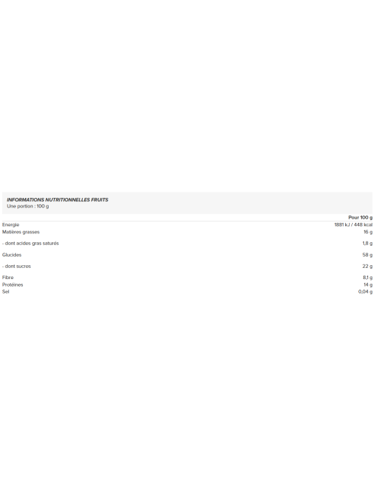 Verrijkt met superfoods is het een uitstekende bron van mineralen (fosfor, magnesium, zink) en vitamine E. Dankzij het hoge vezelgehalte bevordert het een gezonde spijsvertering en verlengt het het verzadigingsgevoel.