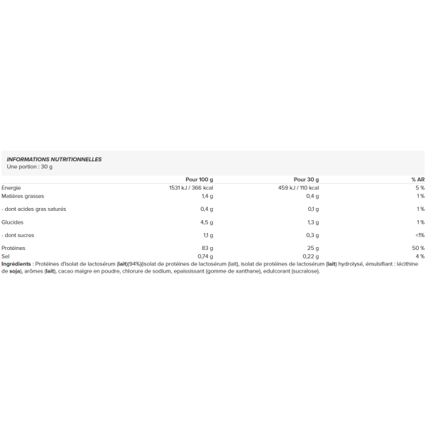 Ingrediënten: Wei-eiwitisolaat(melk) (94%) (wei-eiwitisolaat (melk), gehydrolyseerd wei-eiwitisolaat(melk), emulgator: sojalecithine), aroma's(melk), mager cacaopoeder, natriumchloride, verdikkingsmiddel (xanthaangom), zoetstof (sucralose).