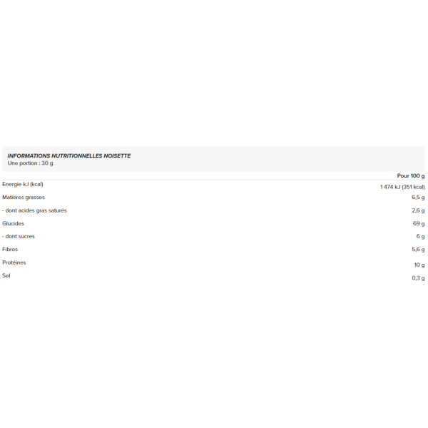 Ingrediënten - hazelnootsmaak : gerolde haver (bevat gluten) 28%, zoetstof (maltitolen), geëxtrudeerde granen 15% (meelmix(tarwe, rijst, maïs), cacaopoeder, zout), hazelnootstukjes 8%(pinda's, aardnoten), tarwevlokken 6%, gehydrolyseerd rundeiwit, rozijnen (rozijnen, zonnebloemolie), bevochtigingsmiddel (glycerol), kokosvet, raapzaadolie, emulgator : lecithine, zuurteregelaar (citroenzuur), zout, aroma, kleurstof (ammoniumsulfietkaramel), cholecalciferol, pteroylmonoglutaminezuur, ijzerhoudend fumaraat.