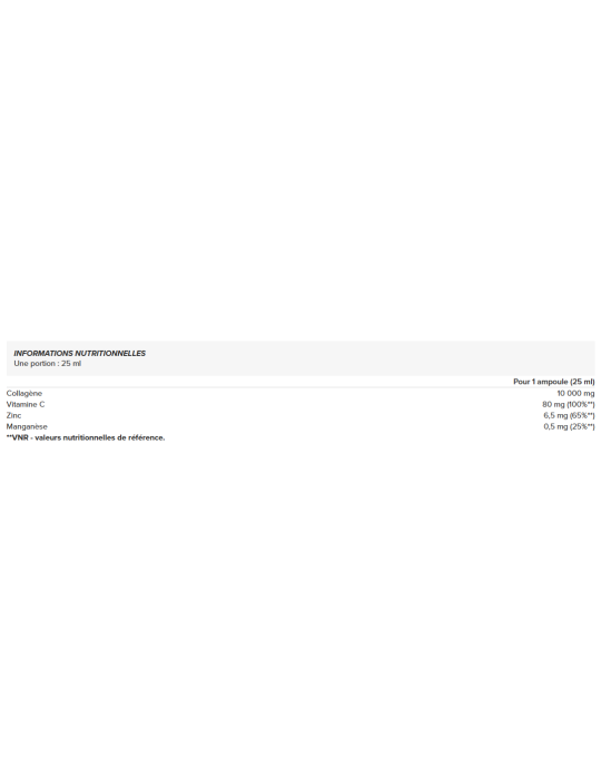 Het bevat 10 gram gehydrolyseerd rundercollageen per dosis van 25 ml, gecombineerd met vitamine C om de collageensynthese te stimuleren, wat essentieel is voor het kraakbeen en de botstructuur. Mineralen zoals zink en mangaan, in de vorm van Albion™ chelaten, maken de formule compleet met voordelen voor haar, nagels en ondersteunende weefsels.