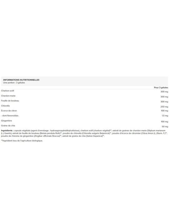 Ingrediënten: plantaardige capsule (glansmiddel: hydroxypropylmethylcellulose), actieve kool (plantaardige koolstof)**, mariadistelzaadextract (Silybum marianum (L.) Gaertn), berkenbladextract (Betula pendula Roth)**, chlorellapoeder (Chlorella vulgaris Beijerinck)**, citroenschilpoeder (Citrus limon (L.) Burm. F.)**, gember wortelstok poeder (Zingiber officinale Roscoe)**, chiazaad extract (Salvia hispanica)**.
