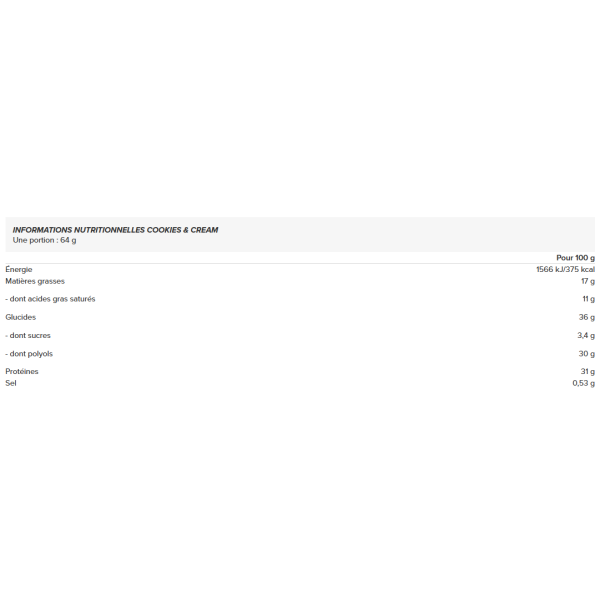 Ingrediënten Cookies & Cream: Melkchocoladelaag met zoetstof 31% (zoetstof (maltitolen)), cacaoboter, volle melkpoeder, cacaomassa, emulgator : lecithinen(soja), natuurlijk aroma], karamellaag met zoetstof 18% [zoetstof (maltitolen), gecondenseerde melk, cacaoboter, bevochtigingsmiddel (sorbitol), emulgator (mono- en diglyceriden van vetzuren), aroma, zout, kleurstof (karamel)], melkeiwit, geëxtrudeerde soja 8,6% (soja-eiwitisolaat, rijstmeel, gerstemoutextract, zout), collageenhydrolysaat, bevochtigingsmiddel (glycerol), water, soja-eiwitisolaat, kokosolie, aroma (bevat melk).