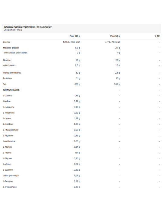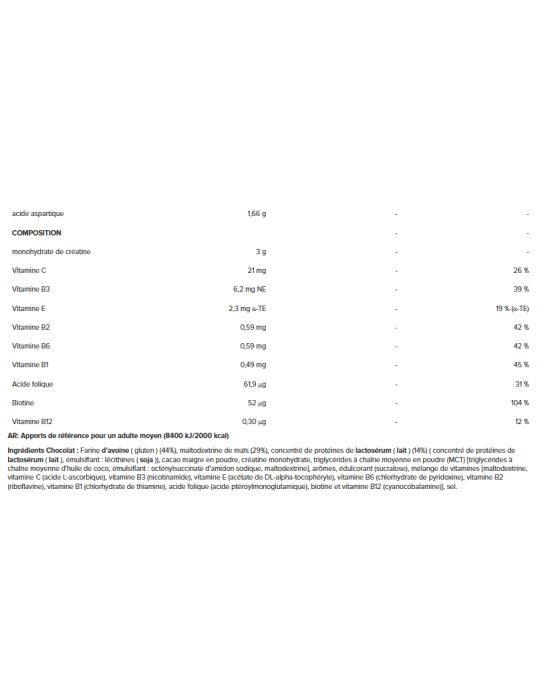 IngrediëntenChocolade:Bloem haver ( gluten ) (44%), maïsmaltodextrine (29%), eiwitconcentraat uit wei ( melk ) (14%) (eiwitconcentraat van wei (melk), emulgator: lecithinen (soja)), magere cacaopoeder, creatinemonohydraat, poeder van triglyceriden met middellange keten (MCT) [triglycérides à chaîne moyenne d'huile de coco, émulsifiant : octénylsuccinate d'amidon sodique, maltodextrine], smaakstoffen, zoetstof (sucralose), vitaminenmix [maltodextrine, vitamine C (acide L-ascorbique), vitamine B3 (nicotinamide), vitamine E (acétate de DL-alpha-tocophéryle), vitamine B6 (chlorhydrate de pyridoxine), vitamine B2 (riboflavine), vitamine B1 (chlorhydrate de thiamine), acide folique (acide ptéroylmonoglutamique), biotine et vitamine B12 (cyanocobalamine)], zout.