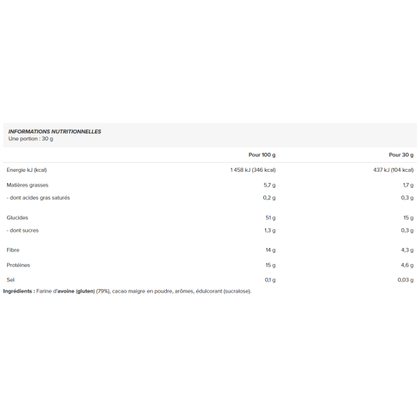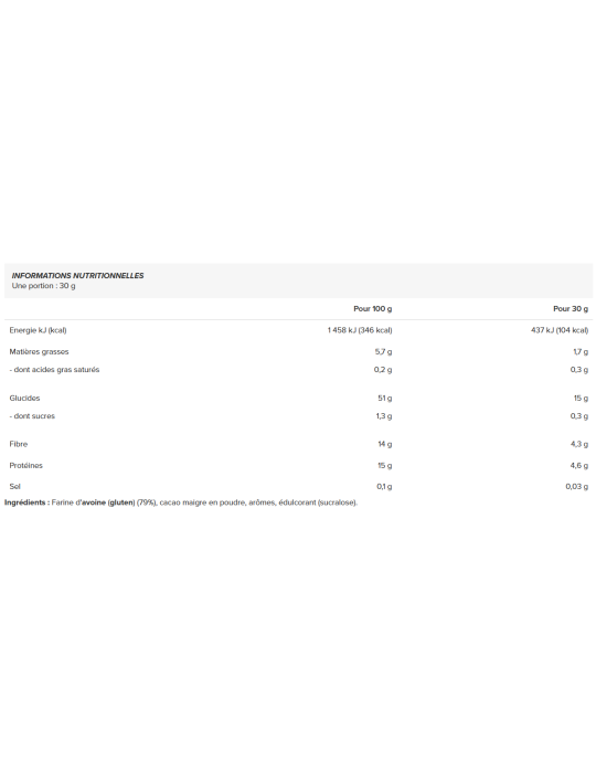 Ingrediënten :Havermeel(gluten) (79%), magere cacaopoeder, aroma's, zoetstof (sucralose).