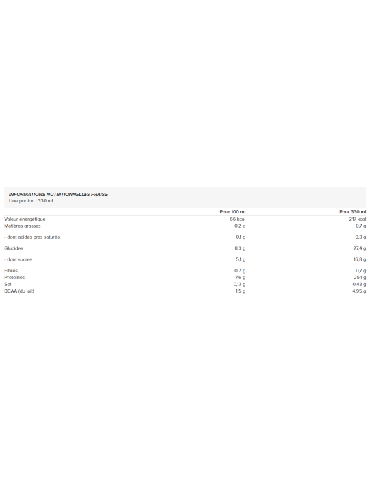 Met 25 g hoogwaardig eiwit, verrijkt met BCAA's en zonder toegevoegde suikers, combineert deze shake effectiviteit en plezier met zijn drie heerlijke smaken: aardbei, vanille en chocolade.