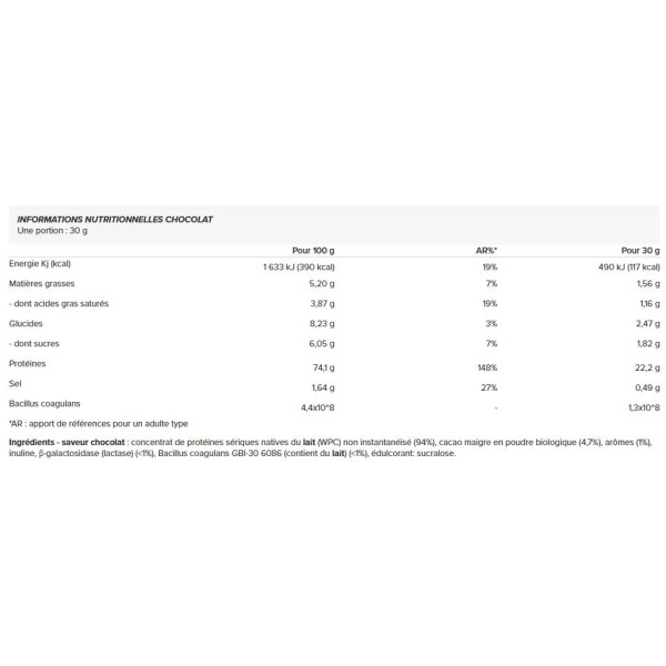 Ingrediënten - chocoladesmaak : niet-geïnstantiseerd natief serum melkeiwitconcentraat (WPC) (94%), biologisch mager cacaopoeder (4,7%), aroma's (1%), inuline, β-galactosidase (lactase) (<1%), Bacillus coagulans GBI-30 6086 (bevat melk) (<1%), zoetstof: sucralose.