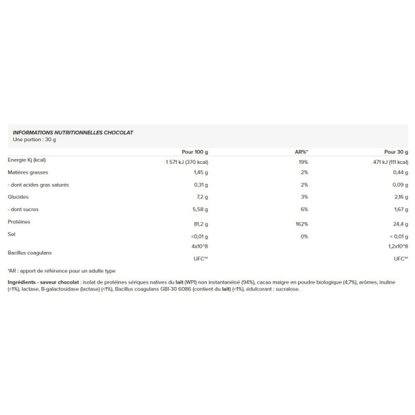 Ingrediënten - chocoladesmaak : niet-geïnstantiseerd natief serum melkeiwitisolaat (WPI) (94%), biologisch mager cacaopoeder (4,7%), aroma's, inuline (<1%), lactase, B-galactosidase (lactase) (<1%), Bacillus coagulans GBI-30 6086 (bevat melk) (<1%), zoetstof: sucralose.