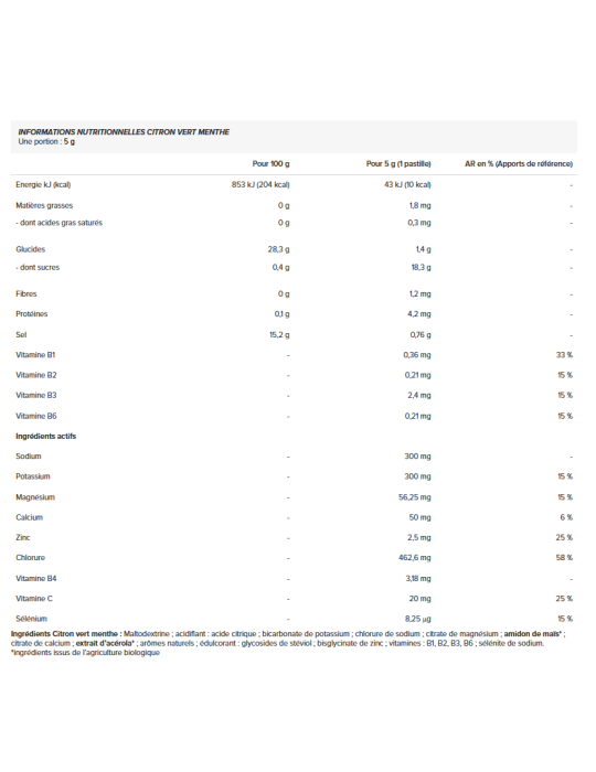 Ingrediënten - Limoen-munt :Maltodextrine; zuurteregelaar: citroenzuur; kaliumbicarbonaat; natriumchloride; magnesiumcitraat ; maïszetmeel* calciumcitraat; acerola-extract* natuurlijke aroma's; zoetstof: steviolglycosiden; zinkbisglycinaat; vitaminen: B1, B2, B3, B6; natriumseleniet. *ingrediënten van biologische landbouw