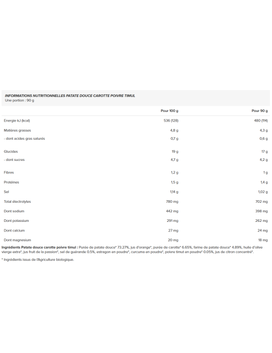 Ingrediënten Zoete aardappel wortel timut peper: Zoete aardappelpuree* 73,27%, sinaasappelsap*, wortelpuree* 6,65%, zoete aardappelmeel* 4,89%, extra vierge olijfolie*, passievruchtensap*, guerande zout 0,5%, dragonpoeder*, kurkumapoeder*, timutpeperpoeder* 0,05%, citroensapconcentraat*.