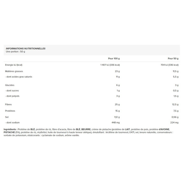 Ingrediënten : TARWE-eiwit, rijst-eiwit, acacia-vezels, TARWE-vezels, BUTTER, pistachecrème (MELK-eiwit, erwten-eiwit, TARWE-eiwit, PISTACHE (5%), rijsteiwit, erythritol, zonnebloemolie met een hoog oliezuurgehalte), emulgator: zonnebloemlecithine, E471, zout, natuurlijke gist, conserveermiddelen: kaliumsorbaat, zoetstoffen: natriumcyclamaat, vanillearoma.