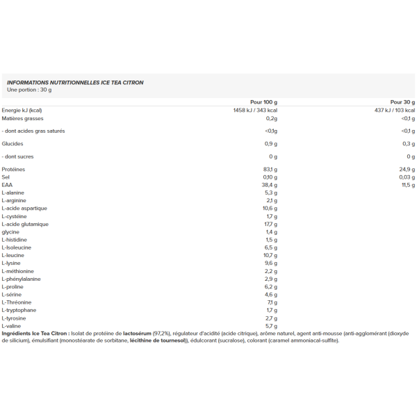 Ingredienten Lemon Iced Tea :Eiwitisolaat van wei (97,2%), zuurteregelaar (citroenzuur), natuurlijk aroma, antischuimmiddel (siliciumdioxide), emulgator (sorbitaanmonostearaat), zonnebloemlecithine), zoetstof (sucralose), kleurstof (ammoniakale karamel-sulfiet).