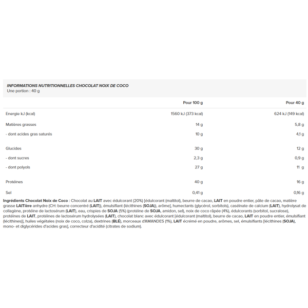 Ingrediënten - Kokoschocolade: MELKchocolade met zoetstof (20%) [zoetstof (maltitol), cacaoboter, volle MELKpoeder, cacaomassa, watervrij MELKvet (CH: geconcentreerde boter(MELK)), emulgator (lecithinen(SOY)), aroma], bevochtigingsmiddelen (glycerol, sorbitolen), calciumcaseïnaat(MELK), collageenhydrolysaat, wei-eiwit(MELK), water, SOYA crispies (5%) (SOYA eiwit, zetmeel, zout), geraspte kokos (4%), zoetstoffen (sorbitol, sucralose), MELK eiwit, gehydrolyseerd wei-eiwit(MELK), witte chocolade met zoetstof [zoetstof (maltitol), cacaoboter, volle melkpoeder, emulgator (lecithinen)], plantaardige oliën (kokosnoot, koolzaad), dextrinen(TARWE), stukjes amandel (1%), magere melkpoeder, aroma's, zout, emulgatoren [lecithinen(SOYA), mono- en diglyceriden van vetzuren], zuurteregelaar (natriumcitraten).