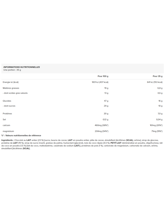 Ingrediënten : volle MELK chocolade (23%) [suiker, cacaoboter, volle MELK poeder, cacaomassa, emulgator (lecithinen(SOJA)), aroma], glucosestroop, MELK eiwit (19%), invertsuikerstroop, palmvet, bevochtigingsmiddel (glycerol), geraspte kokosnoot (4,5%), gedemineraliseerde KLEINE MELKpoeder, oligofructose, kokosmelkpoeder (1,5%) [kokosmelk, maltodextrine, natriumcaseïnaat(MELK)], erwteneiwit (1%), magnesiumcarbonaat, calciumcarbonaat, aroma, emulgator [lecithinen(SOJA)].