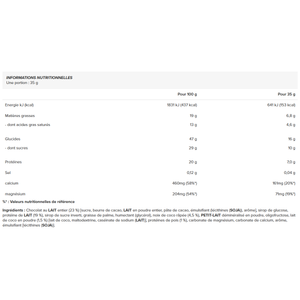Ingrediënten : volle MELK chocolade (23%) [suiker, cacaoboter, volle MELK poeder, cacaomassa, emulgator (lecithinen(SOJA)), aroma], glucosestroop, MELK eiwit (19%), invertsuikerstroop, palmvet, bevochtigingsmiddel (glycerol), geraspte kokosnoot (4,5%), gedemineraliseerde KLEINE MELKpoeder, oligofructose, kokosmelkpoeder (1,5%) [kokosmelk, maltodextrine, natriumcaseïnaat(MELK)], erwteneiwit (1%), magnesiumcarbonaat, calciumcarbonaat, aroma, emulgator [lecithinen(SOJA)].