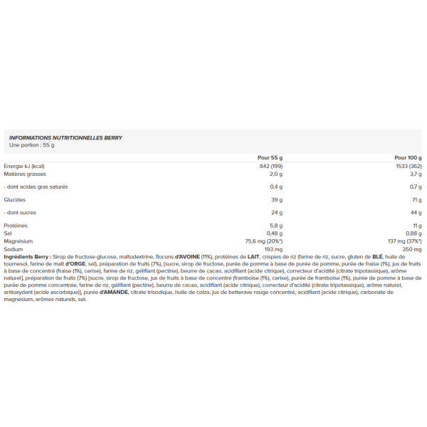 Ingrediënten Berry :Fructose-glucosestroop, maltodextrine, vlokken d'AVOINE (11%), eiwit uit MELK, rijstcrispies (rijstmeel, suiker, rijstgluten) TARWE, zonnebloemolie, moutbloem d'ORGE, vruchtenbereiding (7%), [sucre, sirop de fructose, purée de pomme à base de purée de pomme, purée de fraise (1%), jus de fruits à base de concentré (fraise (1%), cerise), farine de riz, gélifiant (pectine), beurre de cacao, acidifiant (acide citrique), correcteur d'acidité (citrate tripotassique), arôme naturel], vruchtenbereidingen (7%) [sucre, sirop de fructose, jus de fruits à base de concentré (framboise (1%), cerise), purée de framboise (1%), purée de pomme à base de purée de pomme concentrée, farine de riz, gélifiant (pectine), beurre de cacao, acidifiant (acide citrique), correcteur d'acidité (citrate tripotassique), arôme naturel, antioxydant (acide ascorbique)], aardappelpuree amandel, trinatriumcitraat, koolzaadolie, geconcentreerd rodebietensap, zuurteregelaar (citroenzuur), magnesiumcarbonaat, natuurlijke aroma's, zout.